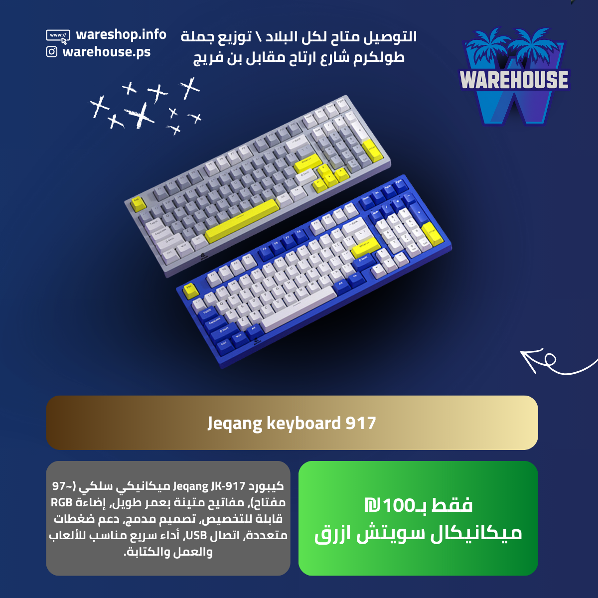 كيبورد Jeqang JK‑917 ميكانيكي سلكي (~97 مفتاح)، مفاتيح متينة بعمر طويل، إضاءة RGB قابلة للتخصيص، تصميم مدمج، دعم ضغطات متعددة، اتصال USB، أداء سريع مناسب للألعاب والعمل والكتابة.